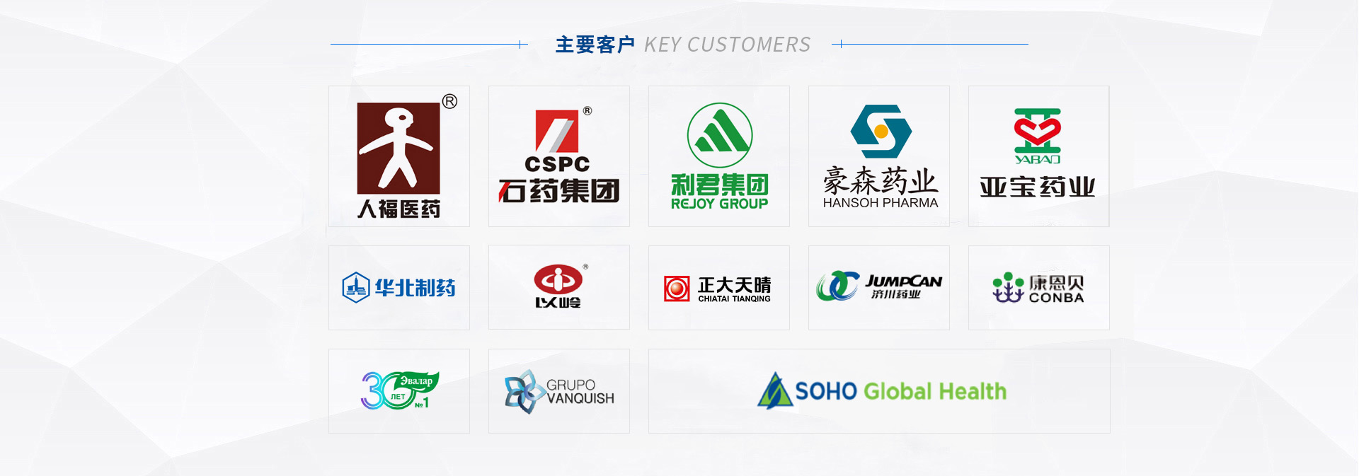 我們的客戶:華藥集團 | 石藥集團 | 九州藥業(yè) | 以嶺藥業(yè) | 正大天晴 |武漢人福 | 西安利君 | 山西亞寶 | 濟川藥業(yè) | 中山達安基因 | 恒升醫(yī)學 | 九州通 | 康恩貝 |四環(huán)藥業(yè) |豪森藥業(yè) | 哈藥集團 | 東北制藥 | 武漢麥鑫利